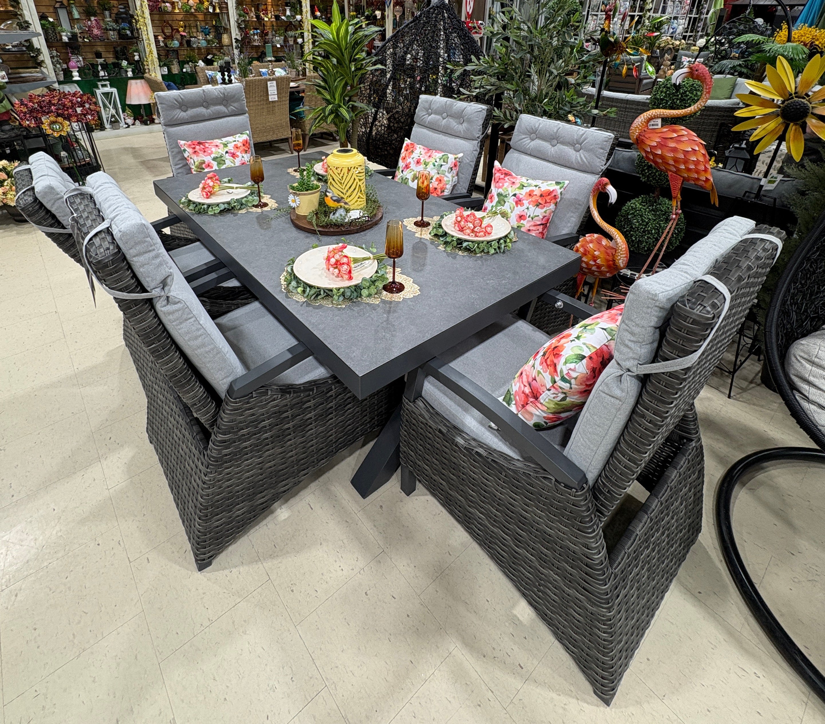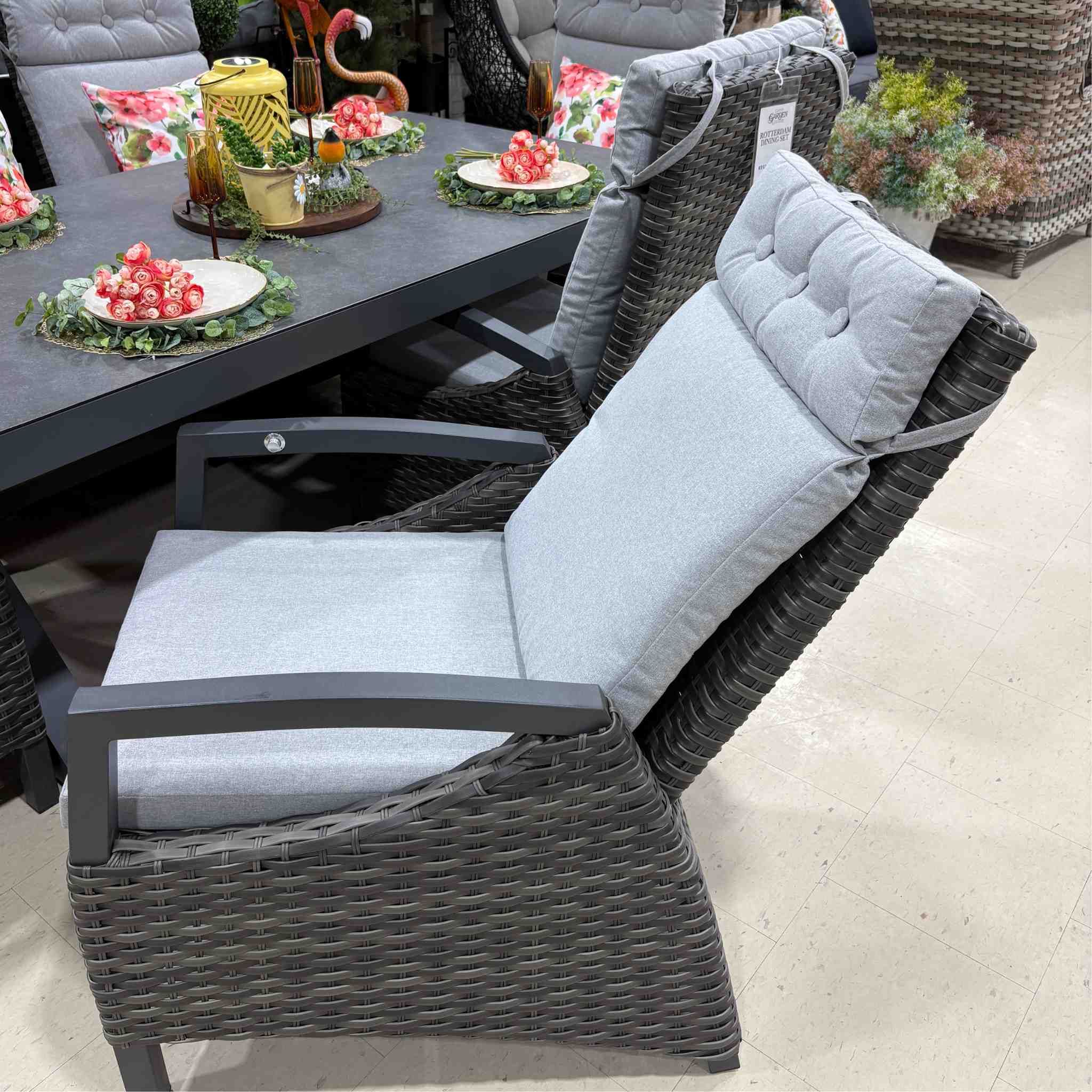 The Rotterdam Dining Set includes 6 reclining dining armchairs, seat cushions and a rectangle dining table. (accessories not included)